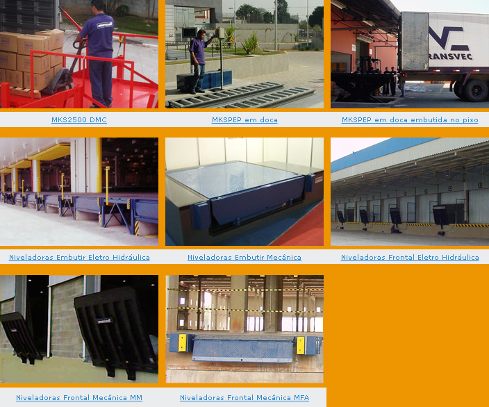* Plataformas Niveladoras de Docas modelos de embutir = Eletro Hidráulica / Manual Mecânica, Frontal = Eletro Hidráulica e Manual Mecânica.